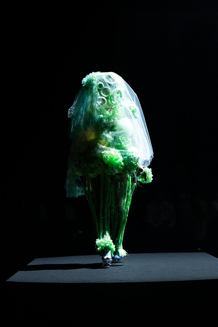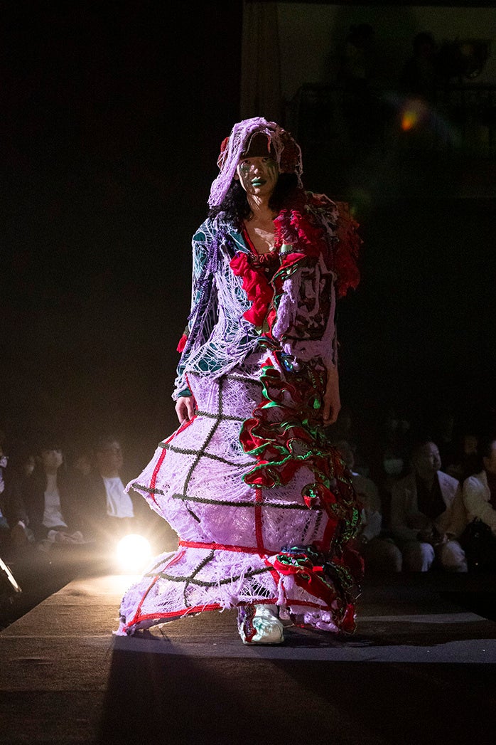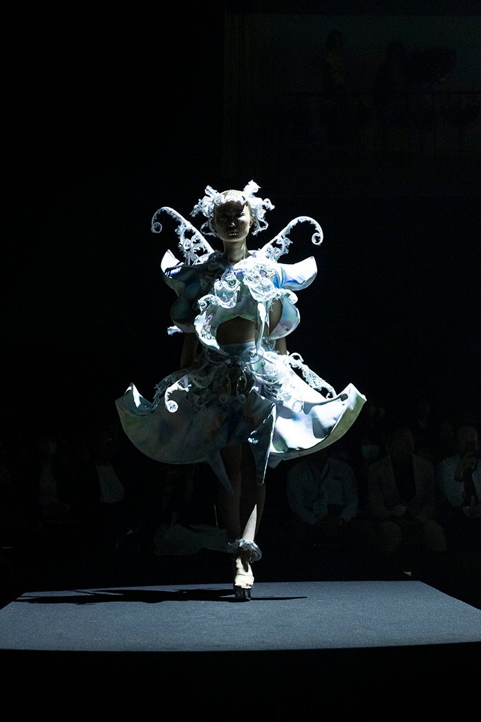 3シーン目の「cell」では、初の試みとしてショーと同時にコンテストとしての機能を持たせ、11名の学生デザイナーが協賛企業であるSHINDOのリボン・テープを使用した作品を制作。