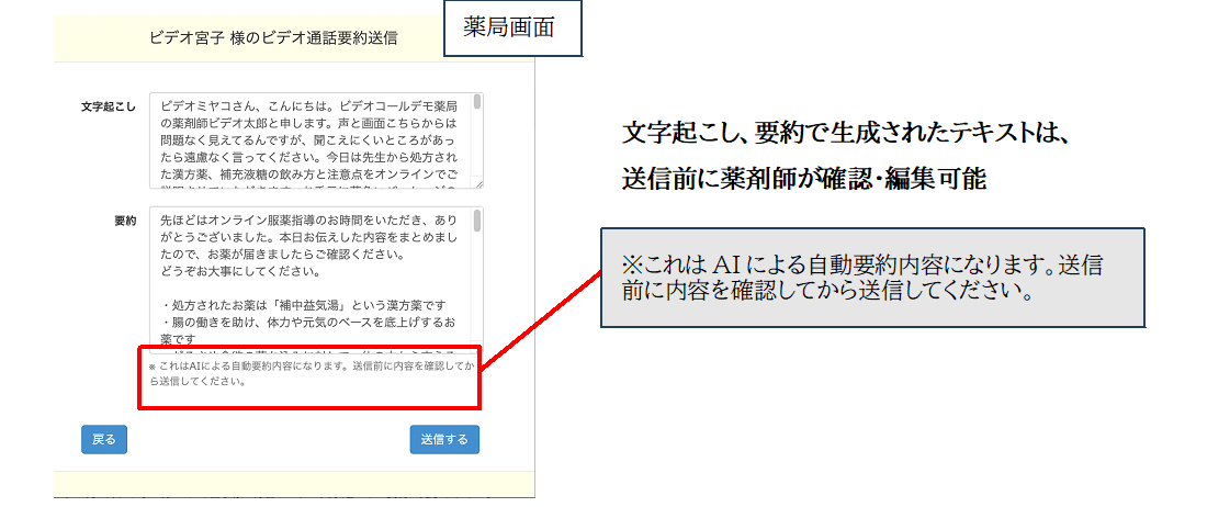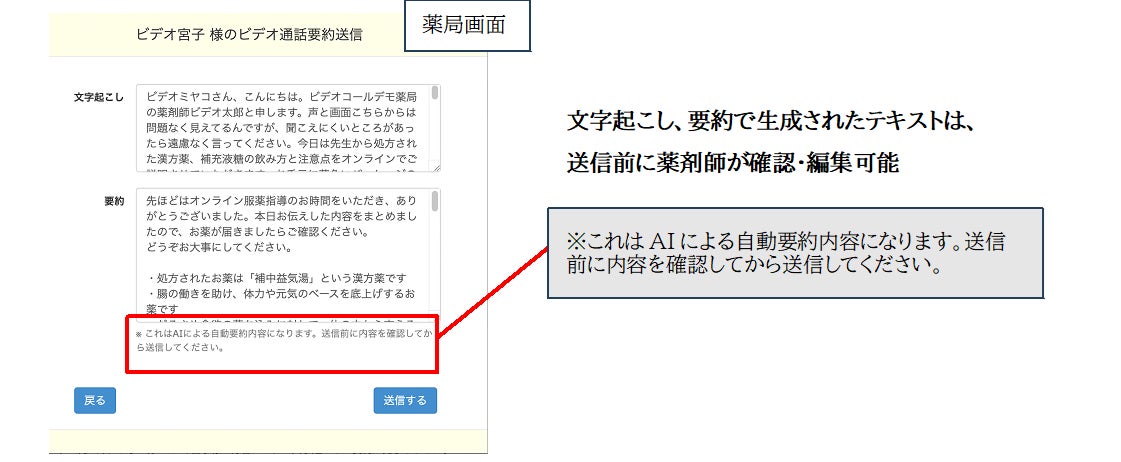 ・生成されたテキストは、送信前に薬剤師が確認・編集でき、医療情報の正確性を担保します。