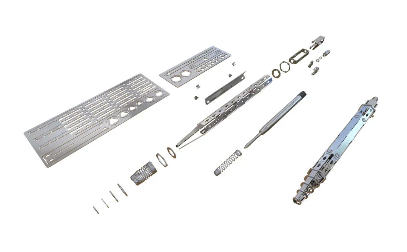 ステンレス製のパーツが道具なしで切り離せ、粘着剤なしでボールペンが作れる!