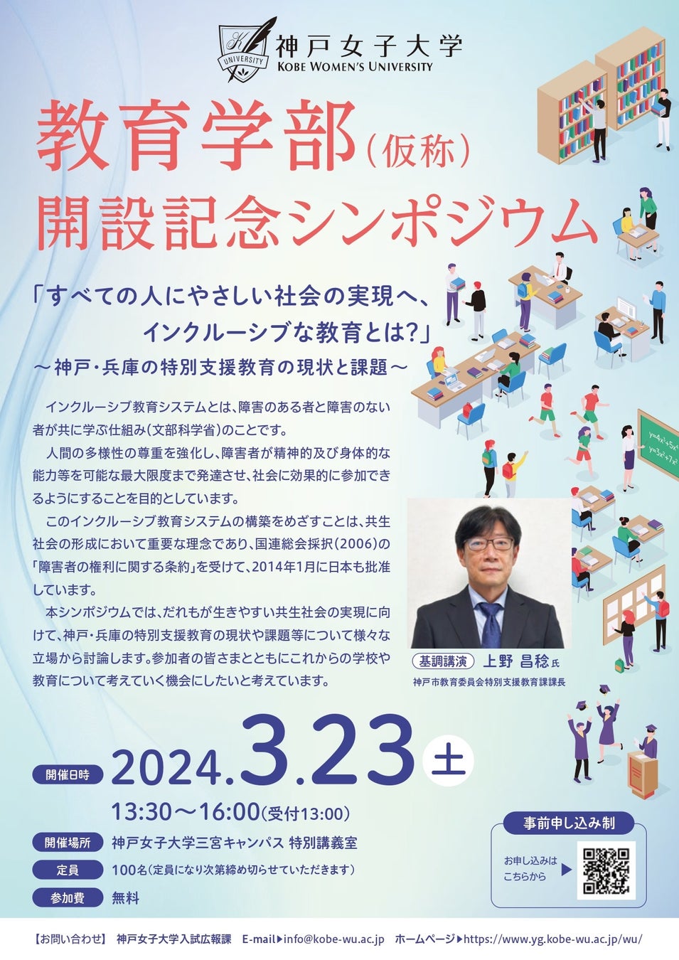 神戸女子大学文学部教育学科は、令和7年4月に教育学部教育学科(仮称・設置構想中)となります。これを記念し、「すべての人にやさしい社会の実現へ、インクルーシブな教育とは?」と題したシンポジウムを開催いたします。