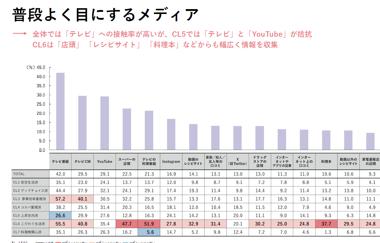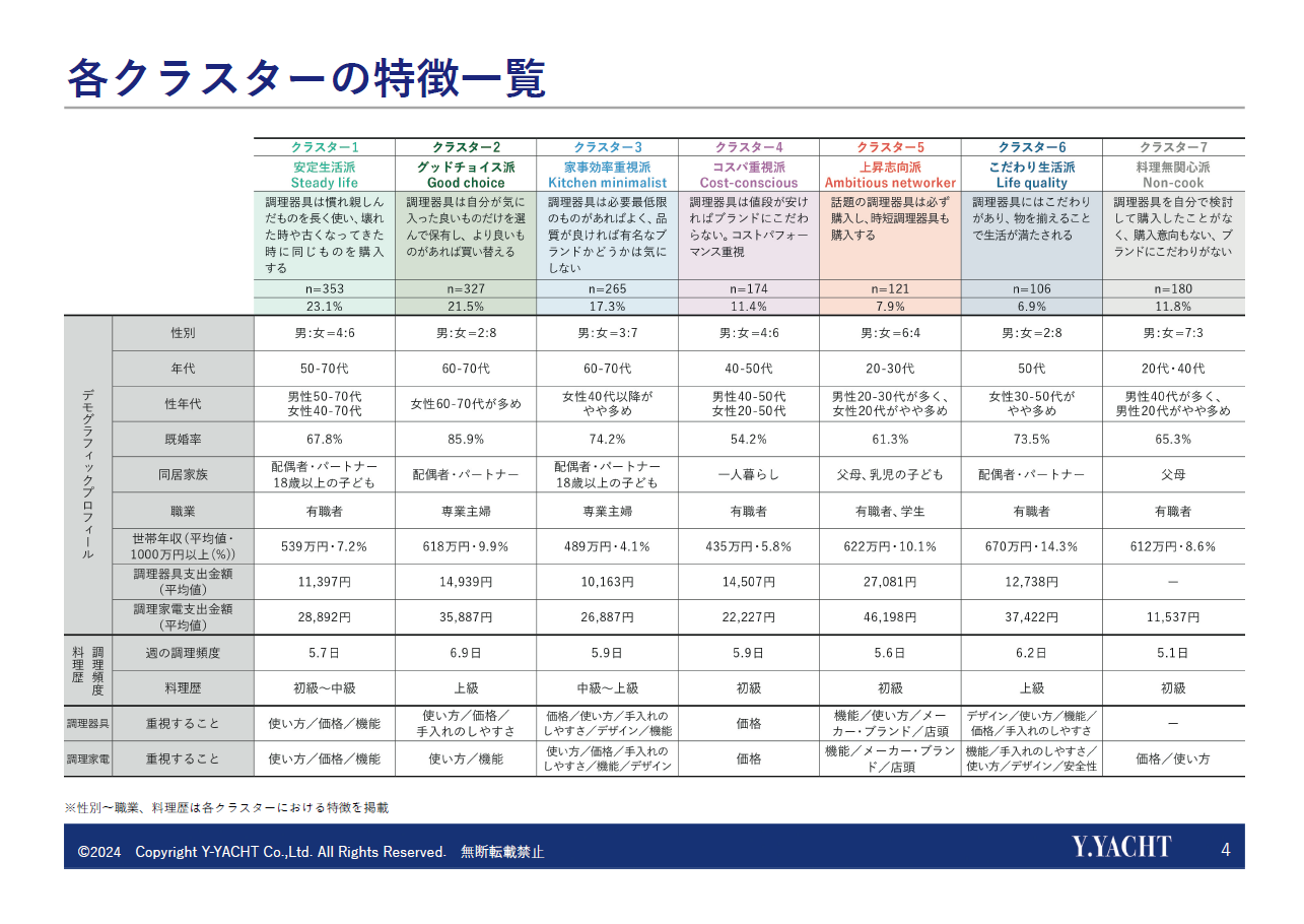 キッチン用品のユーザーを「安定生活派」、「グッドチョイス派」、「こだわり生活派」など、7種類のライフスタイル別に分類しました。