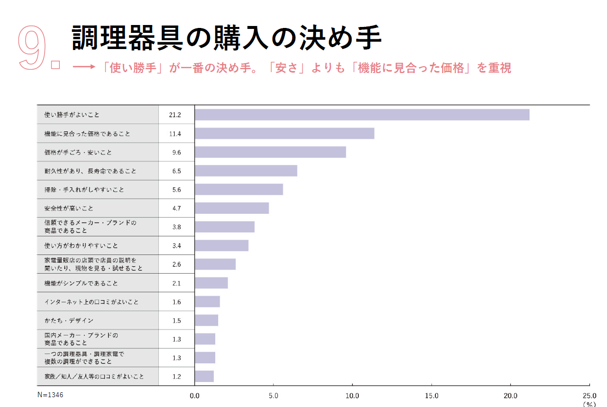 調査内容は、「キッチンに関するお困りごとTop10」、「調理方法の頻度」、「今後購入したいものTop15」など、キッチン用品の購入に関わる質問から、「普段よく目にするメディア」、「昼食の形態」などのライフスタイルに関する質問まで多岐にわたります。