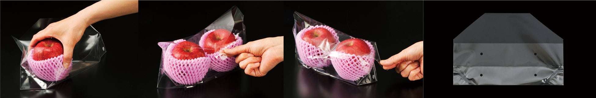 ④従来の『フルーツケース+掛けフィルム』を、一体にした形状で作業効率もアップ。
