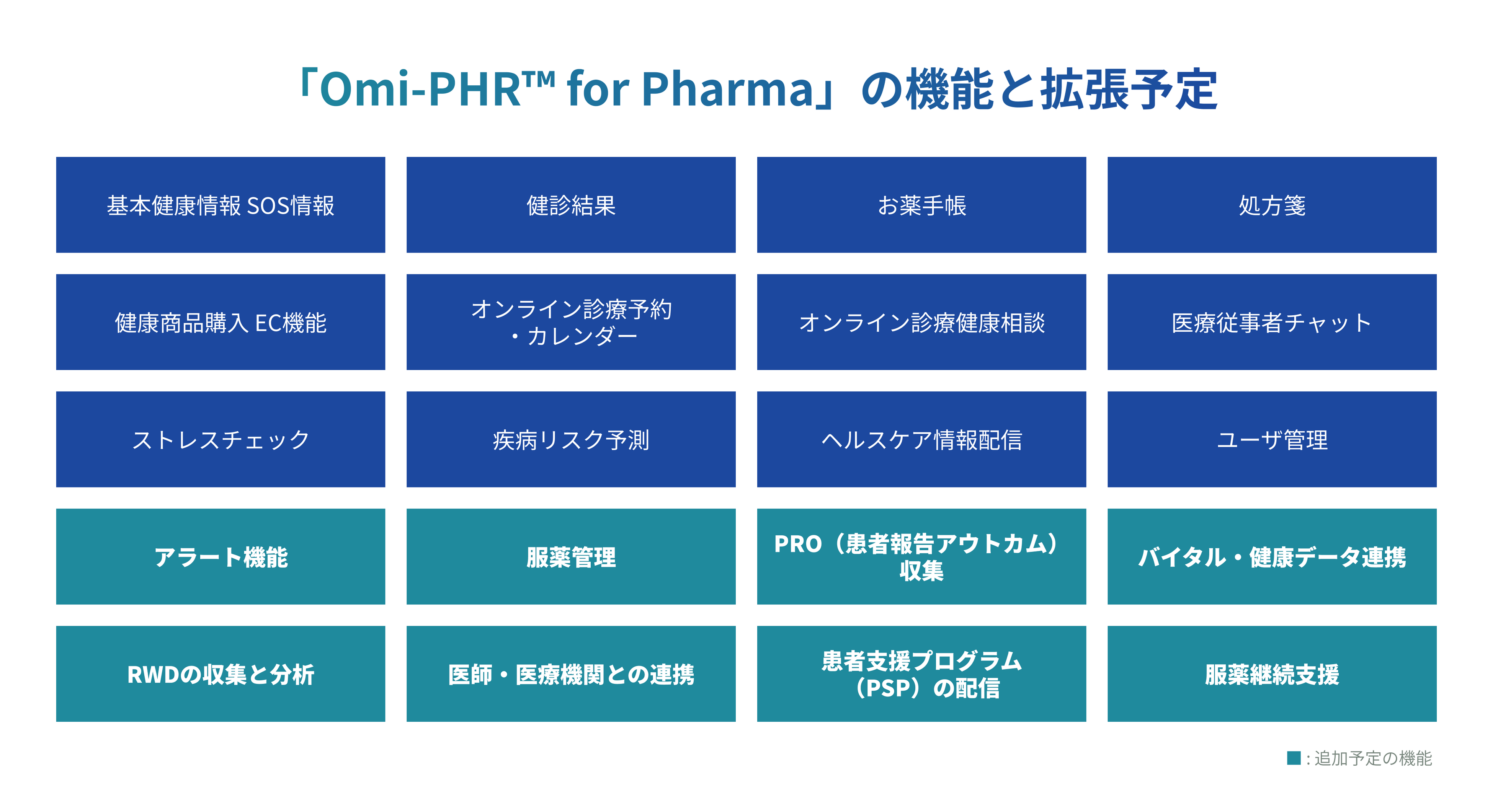 こうした市場環境を受けOmi Japanは、汎用的なPHR開発支援から一歩進み、製薬企業に求められる要件に沿って機能をパッケージ化した「Omi-PHR™ for Pharma」を新たに展開することとしました。