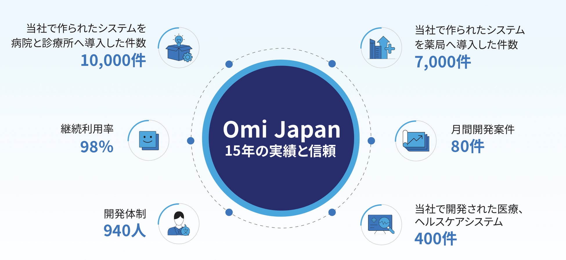 Omi Japan株式会社は日本向けの医療・ヘルスケアシステム開発に特化したオフショア企業です。15年以上の豊富な経験を有し、これまでに400以上のシステムを開発、病院・薬局など累計1万以上の医療機関に導入実績を有しています。開発実績は医療機関の内部で使用するシステム・患者向けシステムのほか、臨床試験・検査、福祉分野にまで多岐に渡ります。