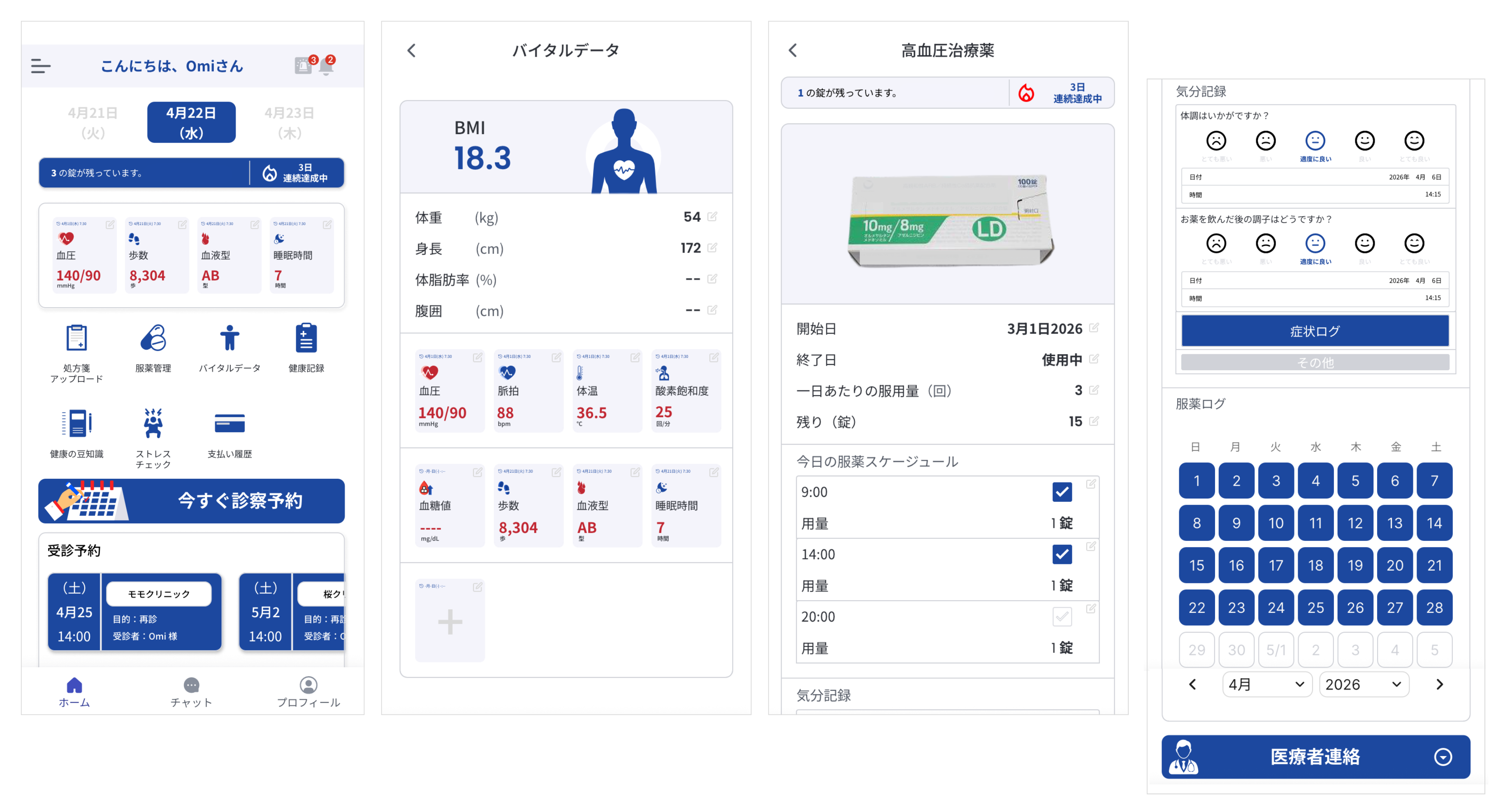 4. バイタル・健康データ連携:血圧、血糖値、体重、歩数などのデータを、ウェアラブルデバイスや測定機器から自動取得する機能です。日常生活の中での健康状態を継続的に把握しやすくします。