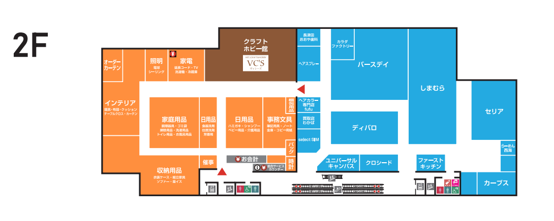 また、2階の生活館にはインテリア用品、カーテン売場を移設。日用品、家庭用品、事務店舗用品、インテリア・カーテン、インテリア用品、カーテン、家電等一般向けの商品群を展開します。