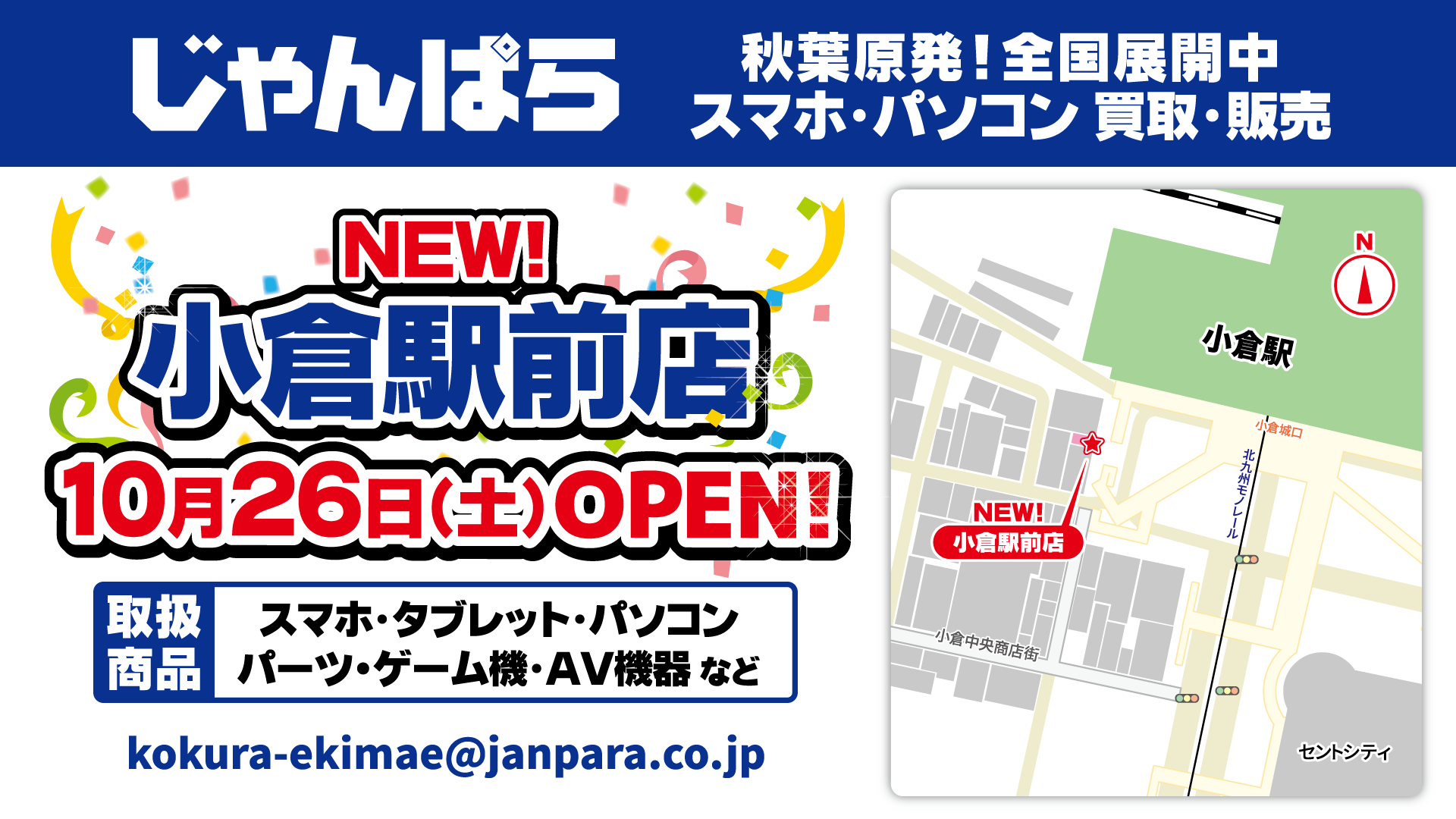 株式会社じゃんぱら(本社:東京都千代田区、代表取締役:小林 直純)が展開するスマホ・パソコンの買取・販売「じゃんぱら」は、「じゃんぱら小倉駅前店」を2024年10月26日(土)にグランドオープンいたします。