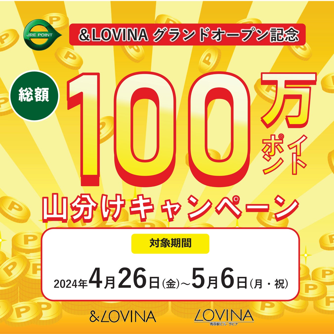 期間中、&LOVINAとラビナにて、合計10,000円(税込)以上お買い上げされたお客さまに、抽選で総額100万ポイントを山分けプレゼント!