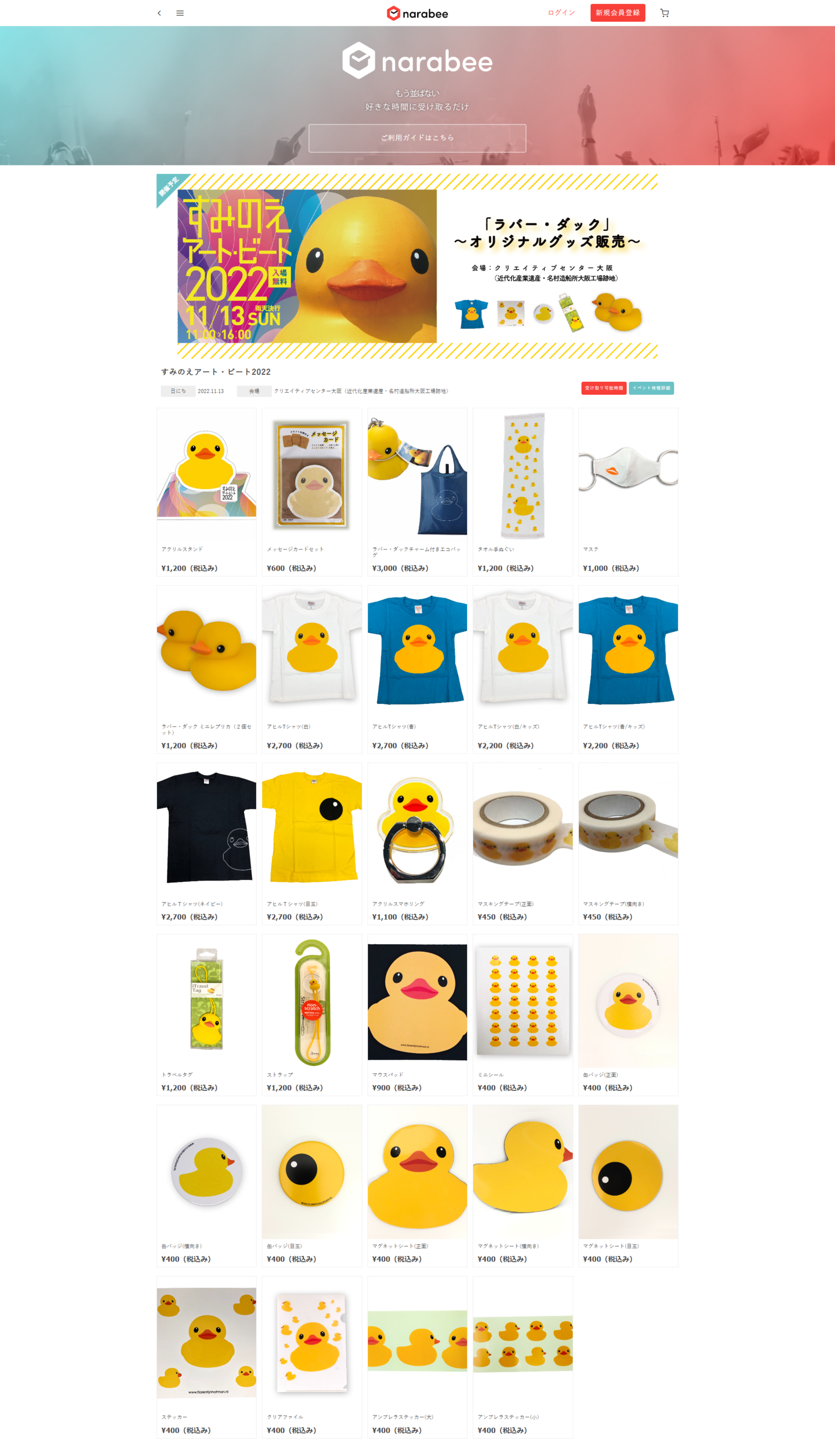 千島土地株式会社(大阪市住之江区)は、11月に開催するイベント「すみのえアート・ビート 2022」(開催日:2022年11月13日(日)、会場:クリエイティブセンター大阪)で販売するラバー・ダックオリジナルグッズの事前注文の受付を、BEENOS Entertainment株式会社が提供するモバイルオーダー・決済サービス「narabee(ナラビ―)」で開始いたしました。