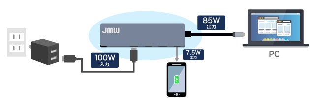 最大100W入力のUSB PDポートを1つ搭載しています。PCに最大85Wまでの急速充電を行いながら、USBデバイスやHDMIディスプレイに接続できます。