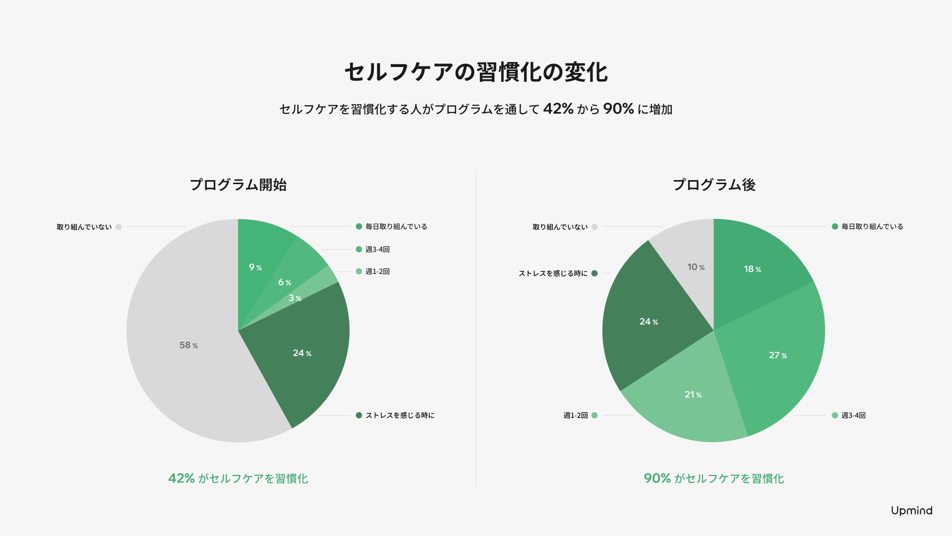 Upmindアプリは手軽にセルフケアの習慣を始められるため、実際に本プログラムを導入した企業では、セルフケアを習慣化する人の割合がプログラム前の42%から、プログラム後には90%にまで増加したという結果が得られています。