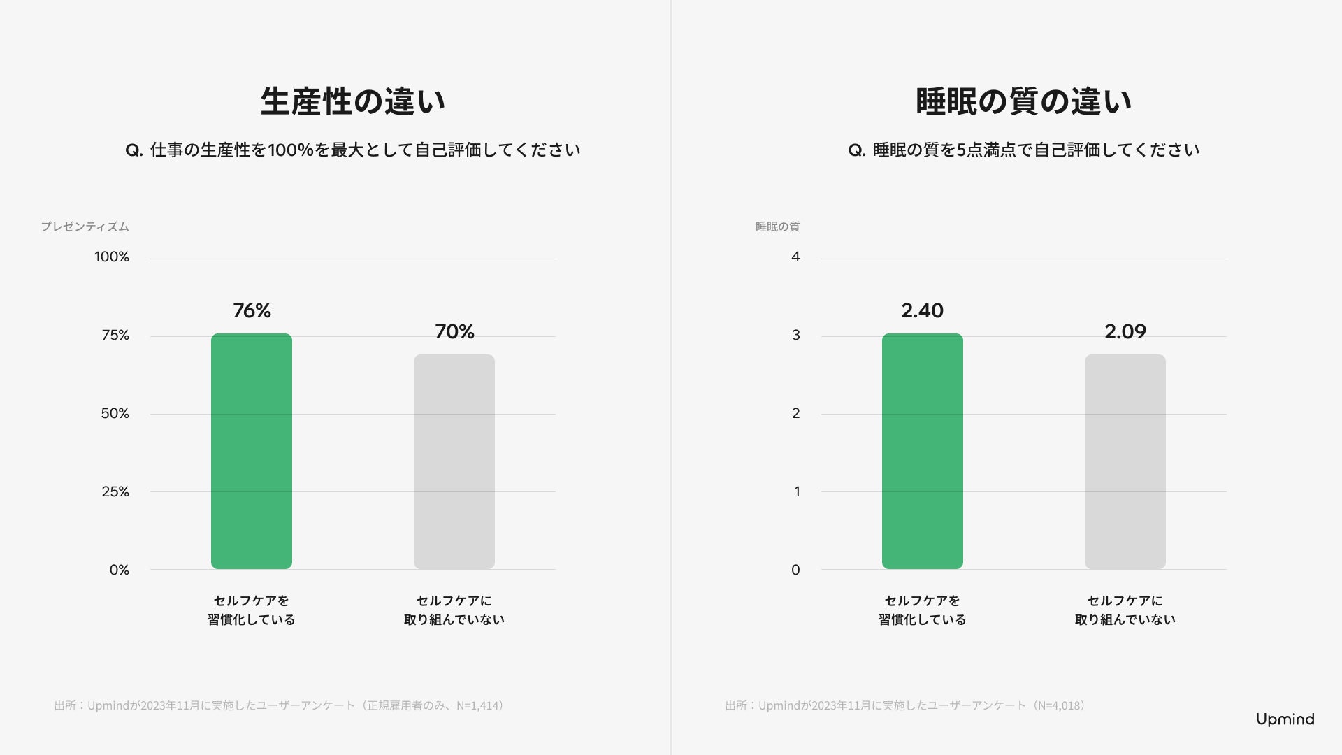 Upmindが2023年11月に実施したユーザーアンケート(回答者数:4,018名)によると、セルフケアを習慣化している人(気になった時に取り組んでいる人も含む)は、そうでない人に比べて、仕事の生産性が約6ポイント高く(76% vs 70%)、睡眠の質の自己評価も高い(2.40点 vs 2.09点)という結果が得られました。