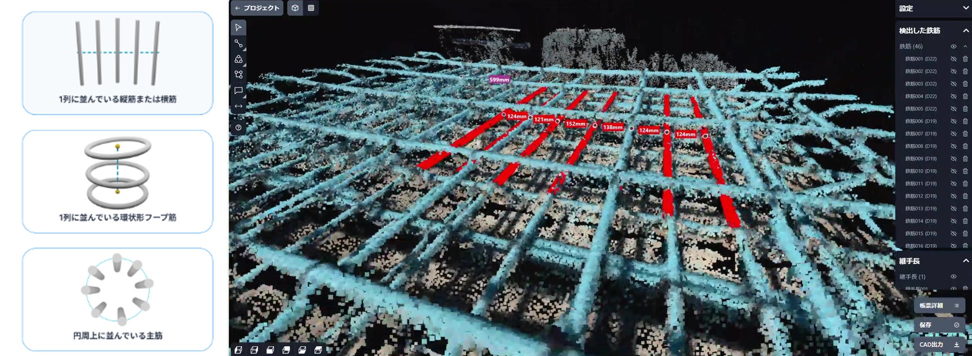 Modelyは点群データを活用した3次元配筋検査システムです。LiDAR付のiPad等でスキャンした鉄筋の点群データをModelyにアップロードし、検査範囲を画面上でクリック指定するだけで、範囲内の鉄筋を一斉に検出し、自動モデル化します。自動生成したモデルから、鉄筋本数・鉄筋間隔等の検査項目を自動計測し、帳票を自動作成することが可能です。また、かぶり厚や重ね継手長も計測することができます。点群データ・3次元モデルや作成した帳票は、施工者と発注者間でクラウド上での共有が可能で、任意の箇所にコメントや写真を付けることもできます。