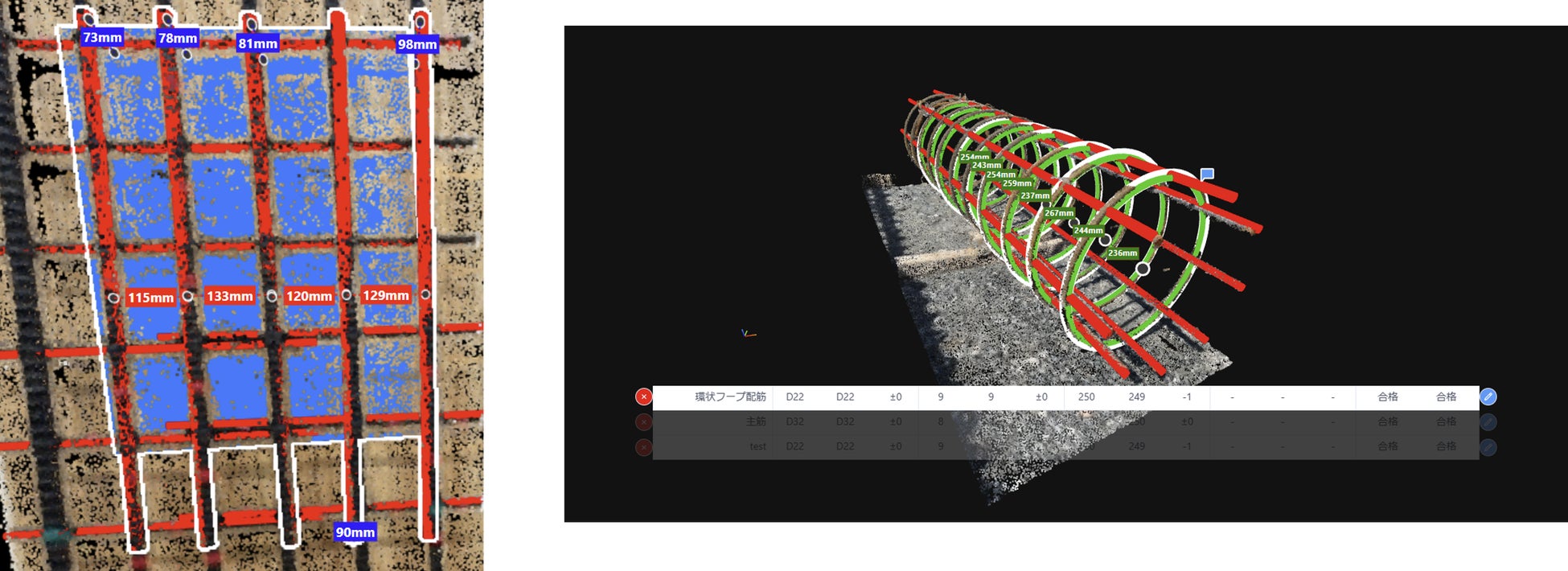 具体的には、配筋CIMデータをModelyのシステムにアップロードするだけで、設計値の自動登録から合否判定までをシステム上で行い、その後の維持管理フェーズにおいても検査で取得したデータがシームレスに繋がる環境を構築して参ります。