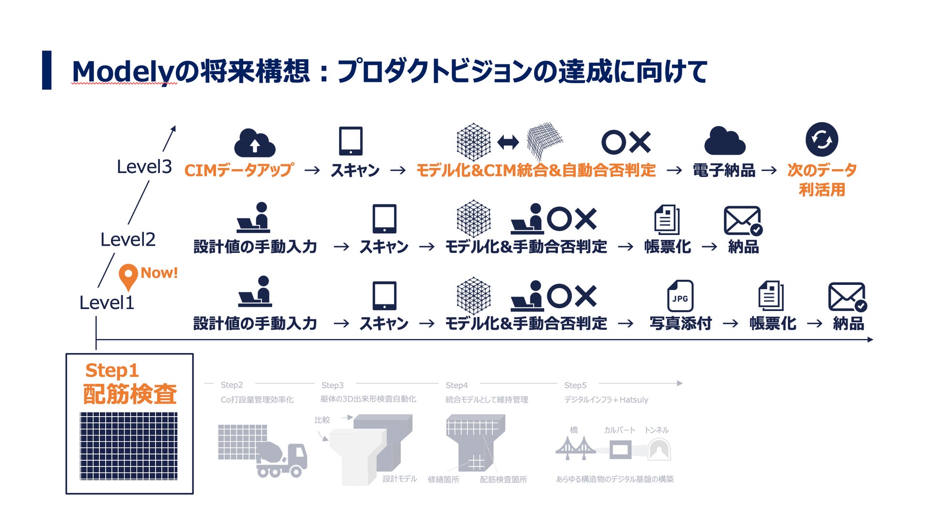 配筋検査においては、現在検査帳票が納品物となっております。Modelyではデジタルデータを活用することで、現状の環境でも帳票作成の効率化や出来形管理写真の削減が可能となっていますが、今後は3次元設計データ(BIM/CIM)を用いて検査のあり方そのものを変えていくことを目指しています。