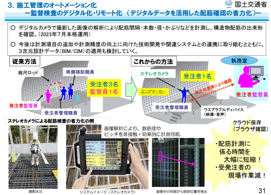 本年4月に策定された、「i-Construction2.0」では、建設現場の生産性の向上のみならず、仕事のあり方そのものを変革し、抜本的な省人化対策を進める必要があることが強調されました。さらに、その実現のための具体的な取組に「デジタルデータを活用した配筋検査」が位置付けられ、3次元設計データ(BIM/CIM)の適用も検討が開始されることも示されました。