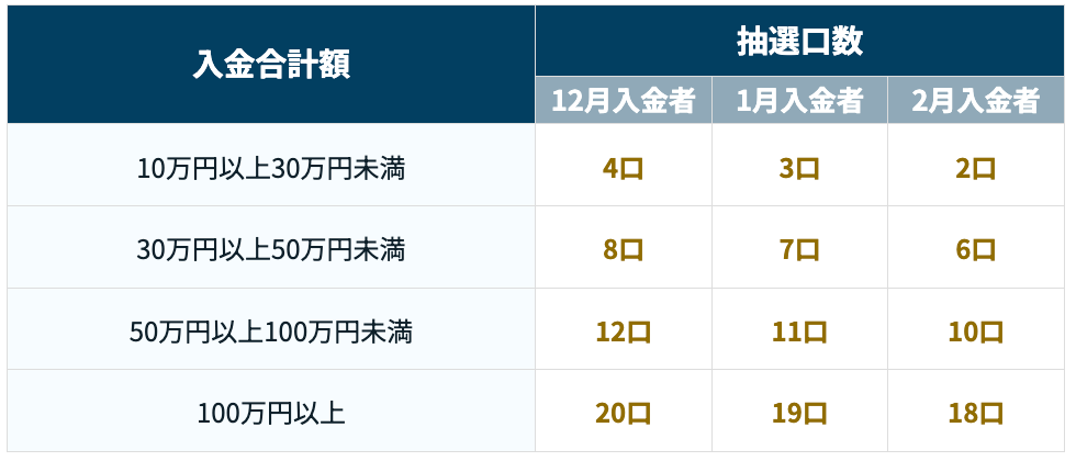 キャンペーン期間中に、エントリーをして対象の入金方法で月に合計10万円以上入金した方を対象に、獲得した抽選口数に応じて最大10万円分のをAmazonギフト券を抽選でプレゼント。