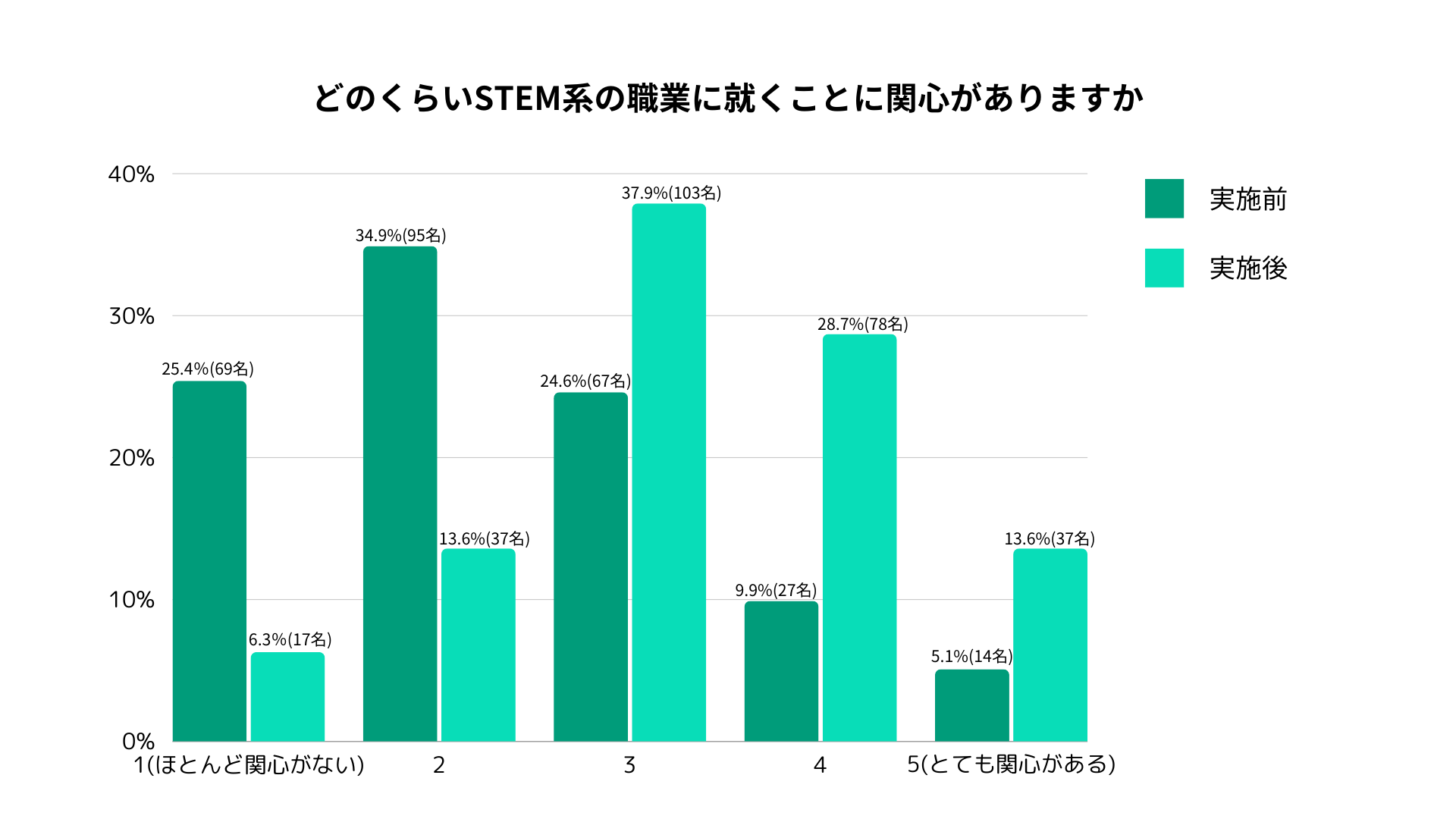 本プログラムを実施後、STEM系の職業に就くことに関心を持つ生徒(関心度が5段階のうち、4-5と回答した)の割合は、実施後に約3倍に増えた。