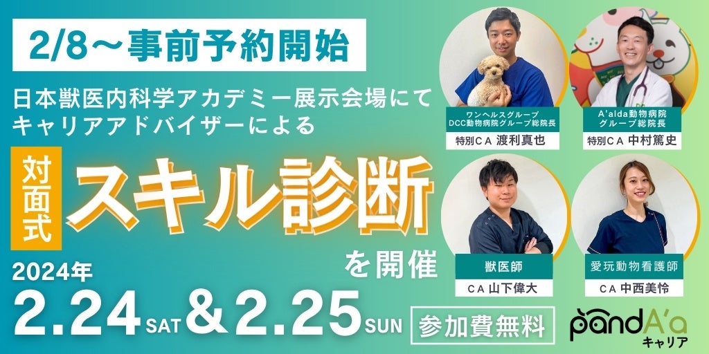 獣医師・動物看護師の就職・転職支援サービス「pandA'aキャリア」、第20回 日本獣医内科学アカデミー学術大会でキャリアアドバイザーによる対面式スキル診断を開催。2月8日から事前予約の受付開始