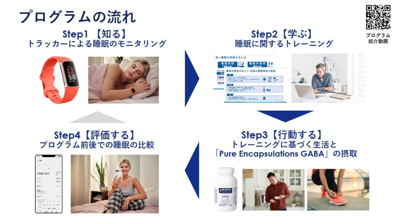 「ネスレ ヘルスサイエンス睡眠プログラム」は、従業員の心身の健康を睡眠の観点からサポートすることを目的としており、ウェアラブルデバイスによる睡眠モニタリング、良い睡眠習慣習得のための睡眠トレーニング、機能性関与成分であるGABA3つを組み合わせ、各企業の状況に合わせたプログラムをご提供します。