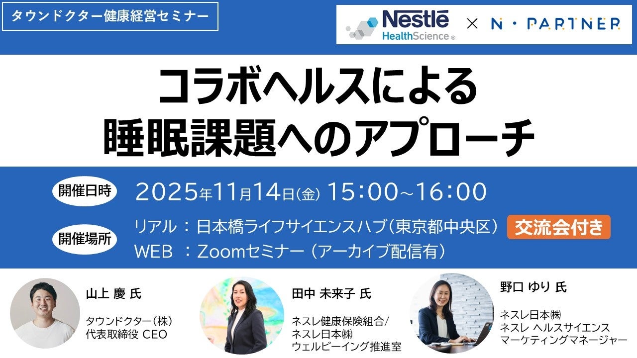 タウンドクター株式会社(所在地:東京都港区、代表者:山上 慶)は、ネスレ日本株式会社 ネスレ ヘルスサイエンス カンパニー(本社:兵庫県神戸市、カンパニープレジデント:中島昭広、以下「ネスレ ヘルスサイエンス」)と連携し、健康経営における睡眠改善プログラム「ネスレ ヘルスサイエンス睡眠プログラム」を共同で展開します。