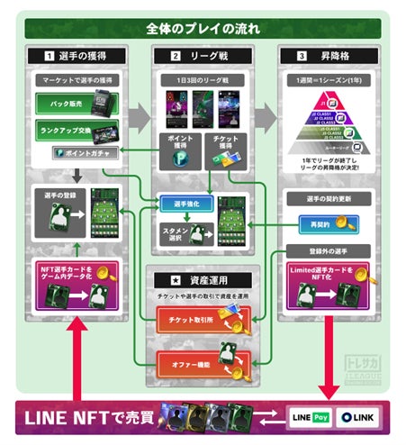 NFT化機能では、育成したLIMITED選手をNFT選手カードに変換して外部マーケット(LINE NFT)にて売買することが可能になります。現在一部のクラブチームでは選手の需要が高まり供給不足になっていたり、購入の際に行列ができ待ち時間が発生しています。NFT化機能を活用することで、これまで入手困難であった選手をLINE NFT上で待ち時間無くユーザー同士で売買することができます。これによりゲーム外の経済圏を拡張してまいります。