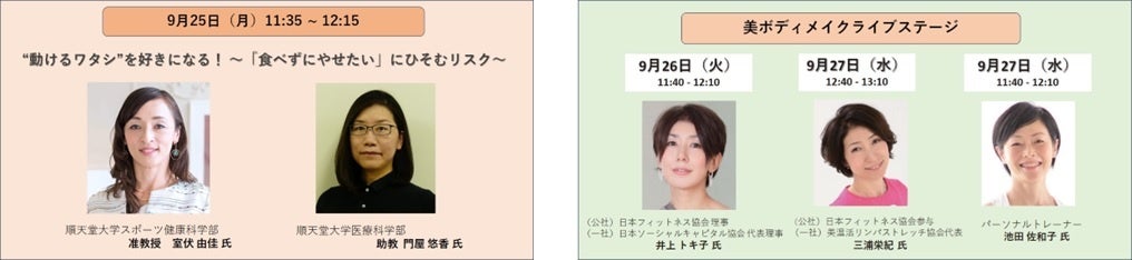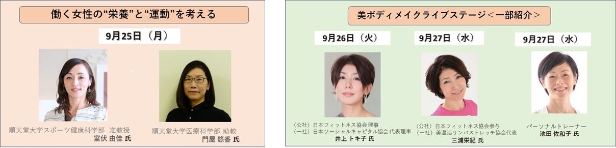 恒例の「美ボディメイク ライブステージ」では、忙しく働く⼥性のライフスタイルのヒントが満載。パーソナルトレーナーをはじめ美容と健康のプロフェッショナルが登壇し美と健康を保つためのメソッドやライフスタイルの秘訣を提案。