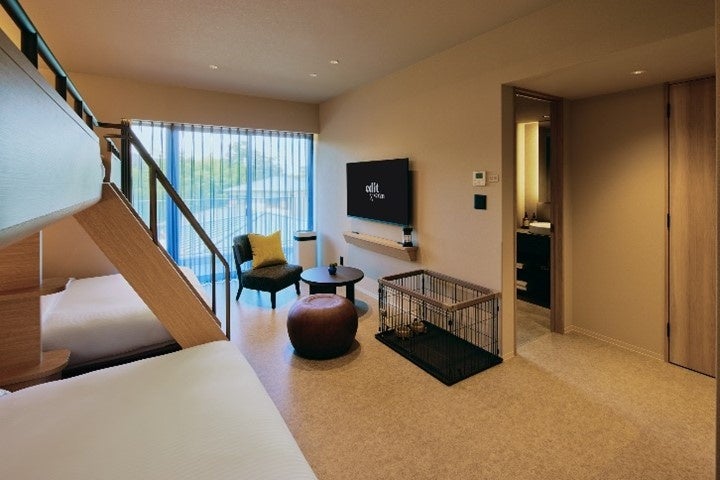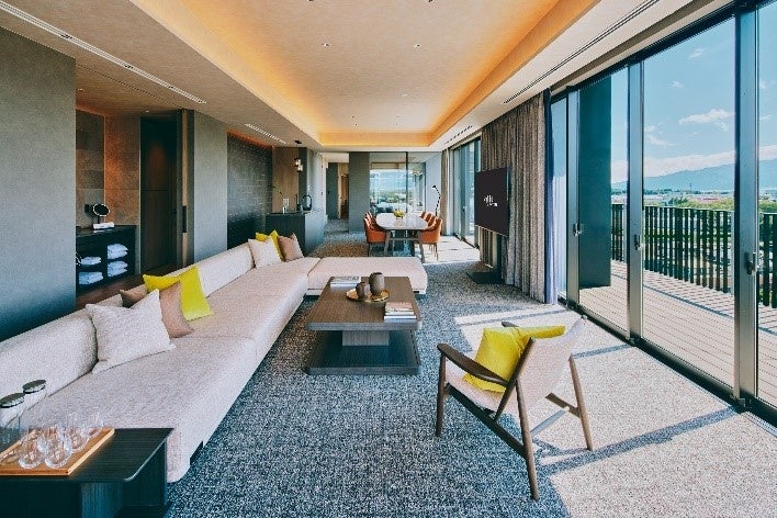 客室は全9タイプ。最大8名様までのグループステイに対応し、157㎡の広々とした客室に154㎡の専用バルコニーを併設したアイコニックなスイートルームやサウナ付き客室、愛犬と泊まれるドッグフレンドリー客室・ドッグランをご用意。