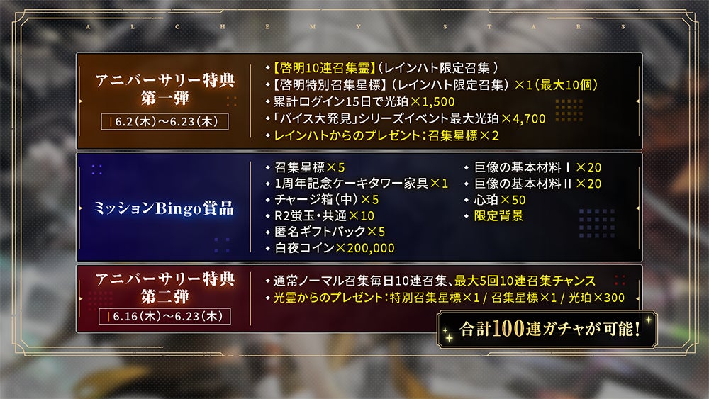 さらに6月2日から同23日にアニバーサリー特典第一弾、ミッションBingo賞品、アニバーサリー特典第二弾を合わせると計100連召集が可能に!新コーデなども登場