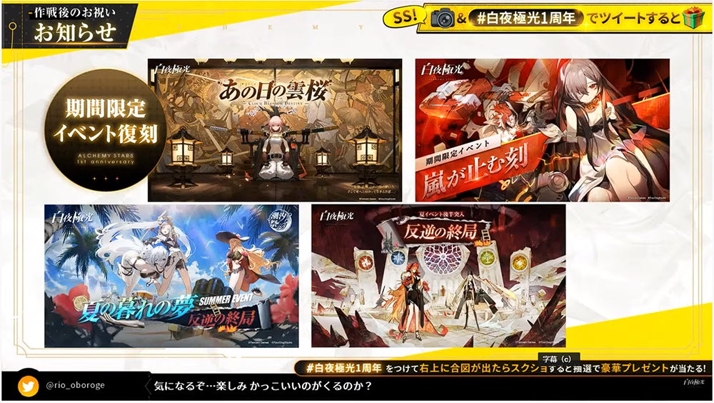 「白夜極光」は、今後も様々なイベントや企画を準備しています。今後の展開は、ゲームのお知らせや公式SNS(https://twitter.com/AlchemyStarsJP)をチェックしてください!