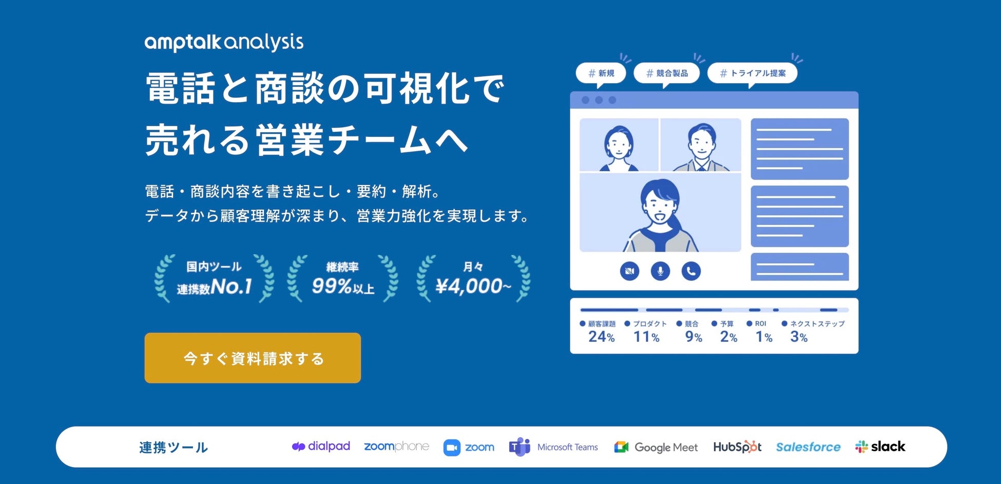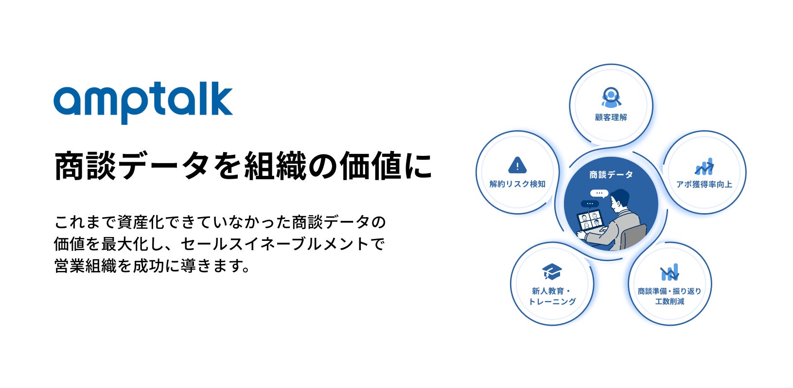 amptalkは、日々の商談データを資産に変え、営業組織のレベルアップを実現します。電話・商談解析ツール「amptalk analysis」、SFA/CRMへの商談記録をAIが支援する「amptalk assist」を通じて、日々の顧客接点から得られるデータをもとにセールスイネーブルメントを実現します。