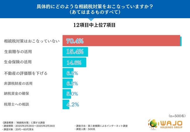 『具体的にどのような相続税対策を行っていますか?(あてはまるものすべて)』と質問したところ、最も多かった回答が「相続税対策は行なっていない(70.4%)」でした。