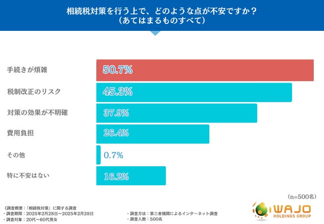 相続税対策を何かしら行っている人に、『相続税対策を行う上で、どのような点が不安ですか?(あてはまるものすべて)』と質問したところ、「手続きが煩雑(50.7%)」が半数以上と最も多く、「税制改正のリスク(45.3%)」「対策の効果が不明確(37.9%)」「費用負担(26.4%)」と続きました。