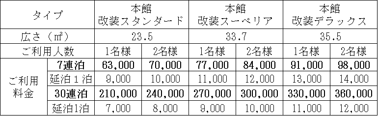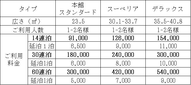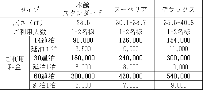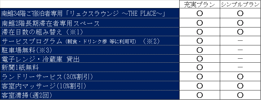 (※1)1回のご滞在日数が3泊単位以上であれば、各パッケージの滞在日数を組み替えることが可能です。尚、組み替えは、<充実プラン>は7泊パッケージで1回、30泊パッケージで5回まで、<シンプルプラン>は14泊パッケージで1回、30泊・60泊パッケージで5回まで可能です。