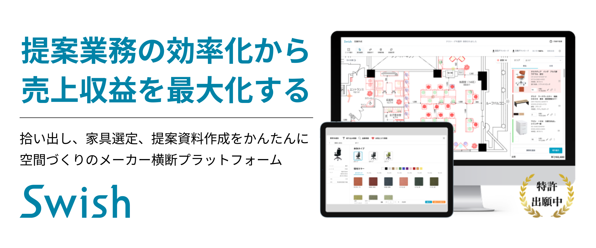 Swish(スウィッシュ)は、空間づくりにおけるメーカー横断のプラットフォームとして、空間提案の業務工数を80%削減するとともに、クオリティの高い空間提案をサポートするシステムです。