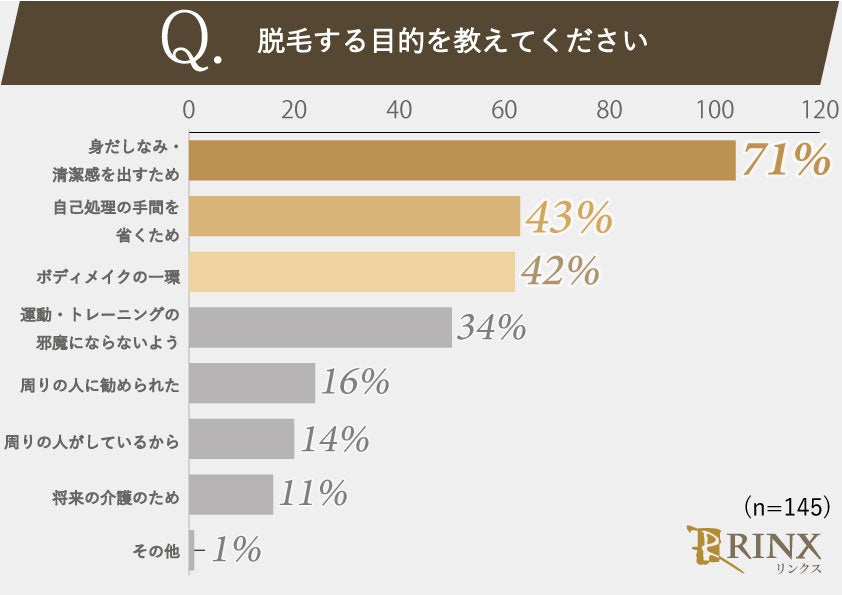 脱毛経験についての質問で「既に脱毛をしている」「これから脱毛する予定」「脱毛をしているが興味はある」と回答した方に、「トレーニング・ボディメイク目的で脱毛した、もしくは脱毛したい部位を教えてください(複数回答)」と聞いたところ、【1位:太もも・すね毛・足の毛(57%)、2位:ワキ毛(54%)、3位:ヒゲ・顔の毛(50%)】という結果が出ました。