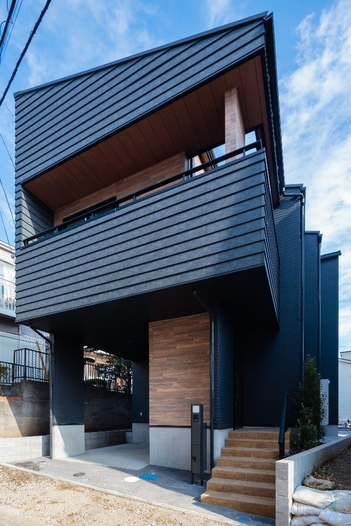 難しい立地条件を最大限に活用した住宅密集地にも映えるモダンな外観です。一体化した袖壁と軒が前面への広がりを、ラップサイディングの水平ラインが横への広がりを感じさせる妙々たるデザインです。