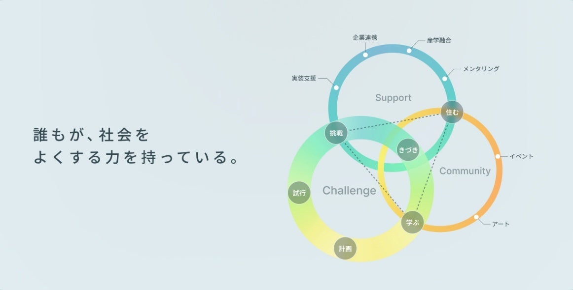 社会課題解決や価値創造をキーワードに、「学ぶ」・「挑戦する」・「住む」を3本の柱に据えたこれまでにない共創空間。