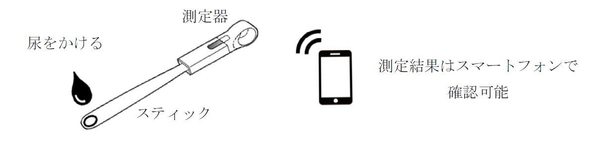 測定器にスティック装着し、尿を数滴かけることで、尿中の「尿酸・尿糖・ナトリウム/カリウム」が測定でき、スティックは使い捨てで衛生的に使用することができます。測定データはクラウド上で解析・保存され、スマートフォン等の端末で確認や管理することができます。