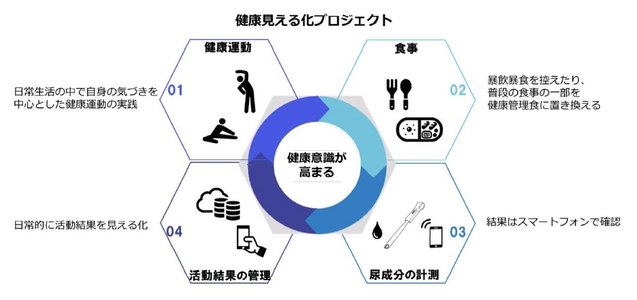 本プロジェクトでは、自身の健康状態を数値で見える化し健康活動の成果を実感することで、生活者の健康意識が高まり自発的な行動変容が促されるのかを確認します。