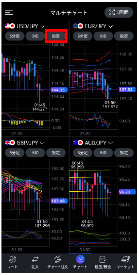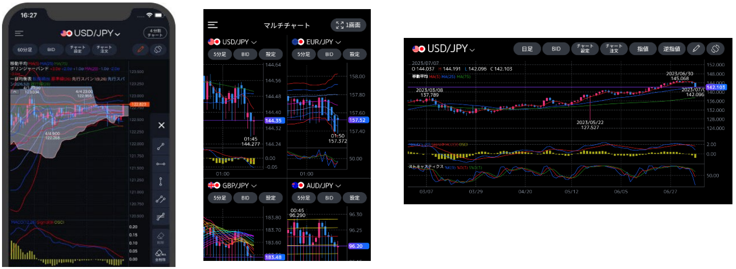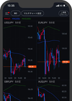 4画面チャートで、複数の通貨ペアや足種類を同時に表示!人気のテクニカル指標も多数搭載し、ライン描画も可能に。また横画面チャートでさらに見やすく分析することができます。