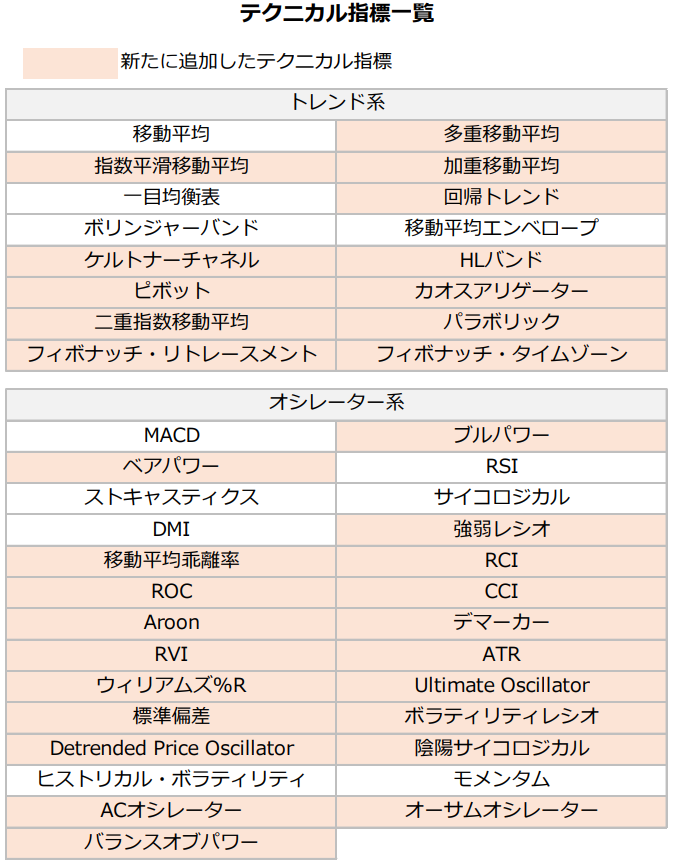 ●チャートのテクニカル指標の種類を拡充しました(11種類→43種類)