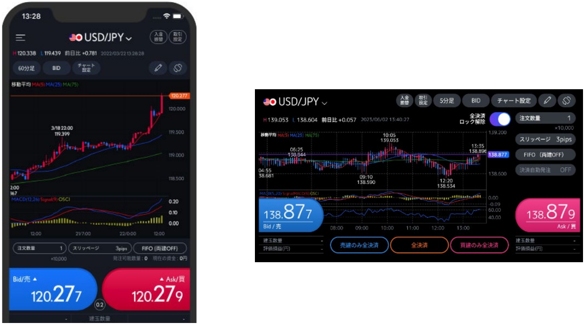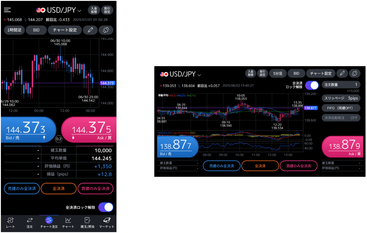 チャートや建玉の評価損益を確認しながら、スピーディーに取引が可能!横画面でも利用できます。
