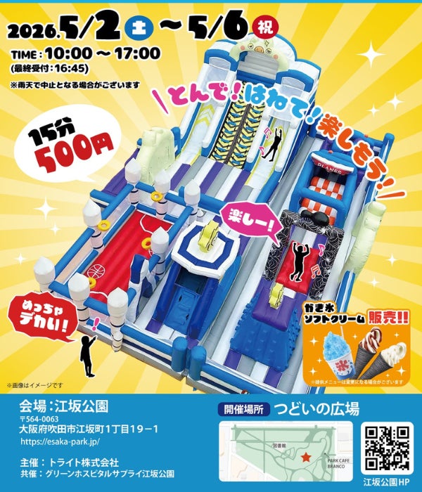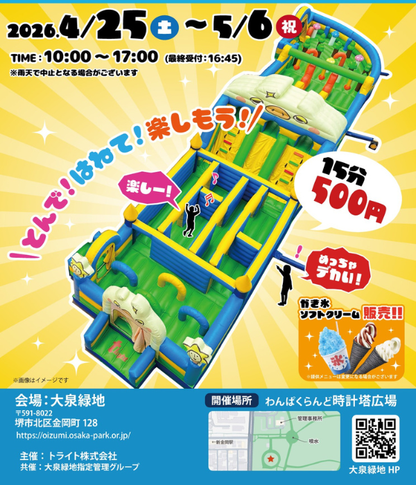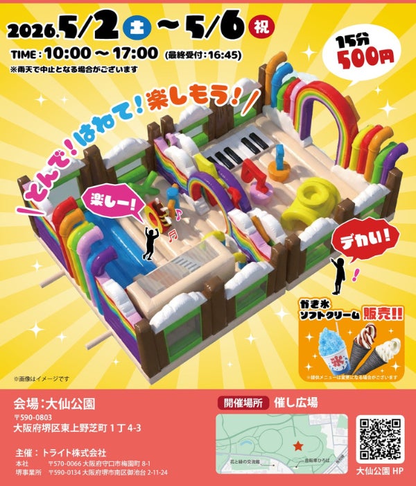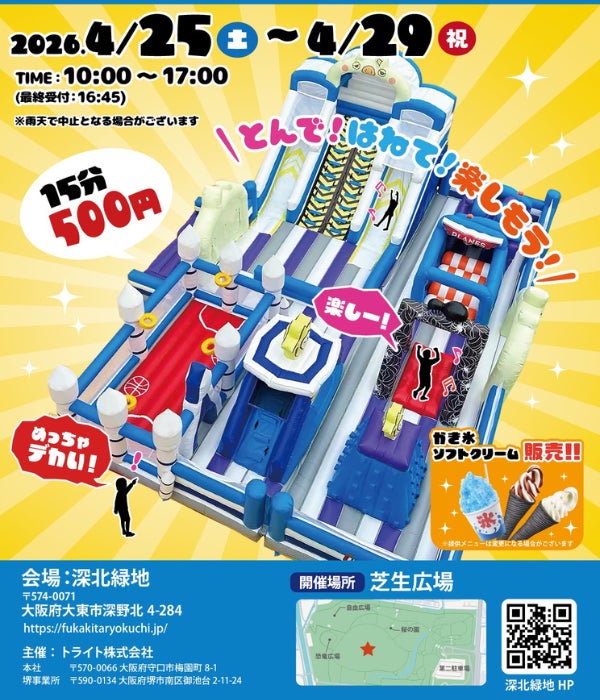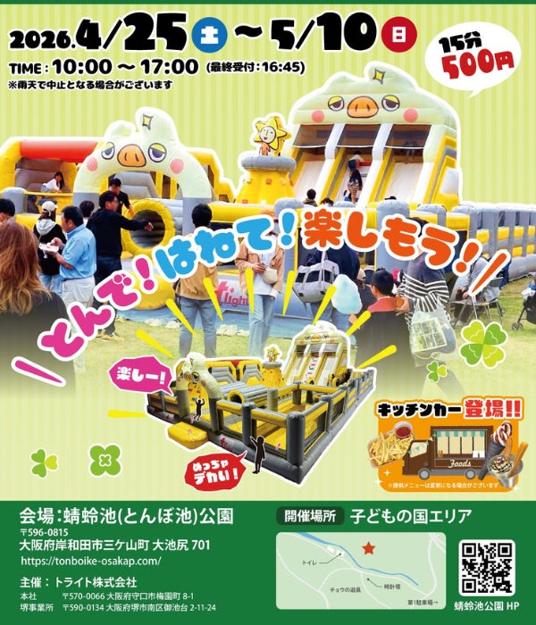 トライト株式会社(本社:大阪府守口市、代表:山田 康生)は、2026年4月25日(土)から5月10日(日)までの16日間、3歳から小学生以下のお子様を対象とした大型エア遊具イベント「ぽよぽよ遊具フェスティバル2026」を開催いたします。会場は大阪府内の公共地公園や兵庫県、滋賀県のテーマパークの計8カ所となります。