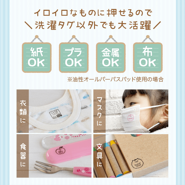 付属のインク台は速乾性の顔料系インクで、そのままお洗濯もOK。しかも紙・プラ・金属にも使えるから、様々な通園通学アイテムにご利用いただけます。これ1つであらゆるものへの名前付けに大活躍!