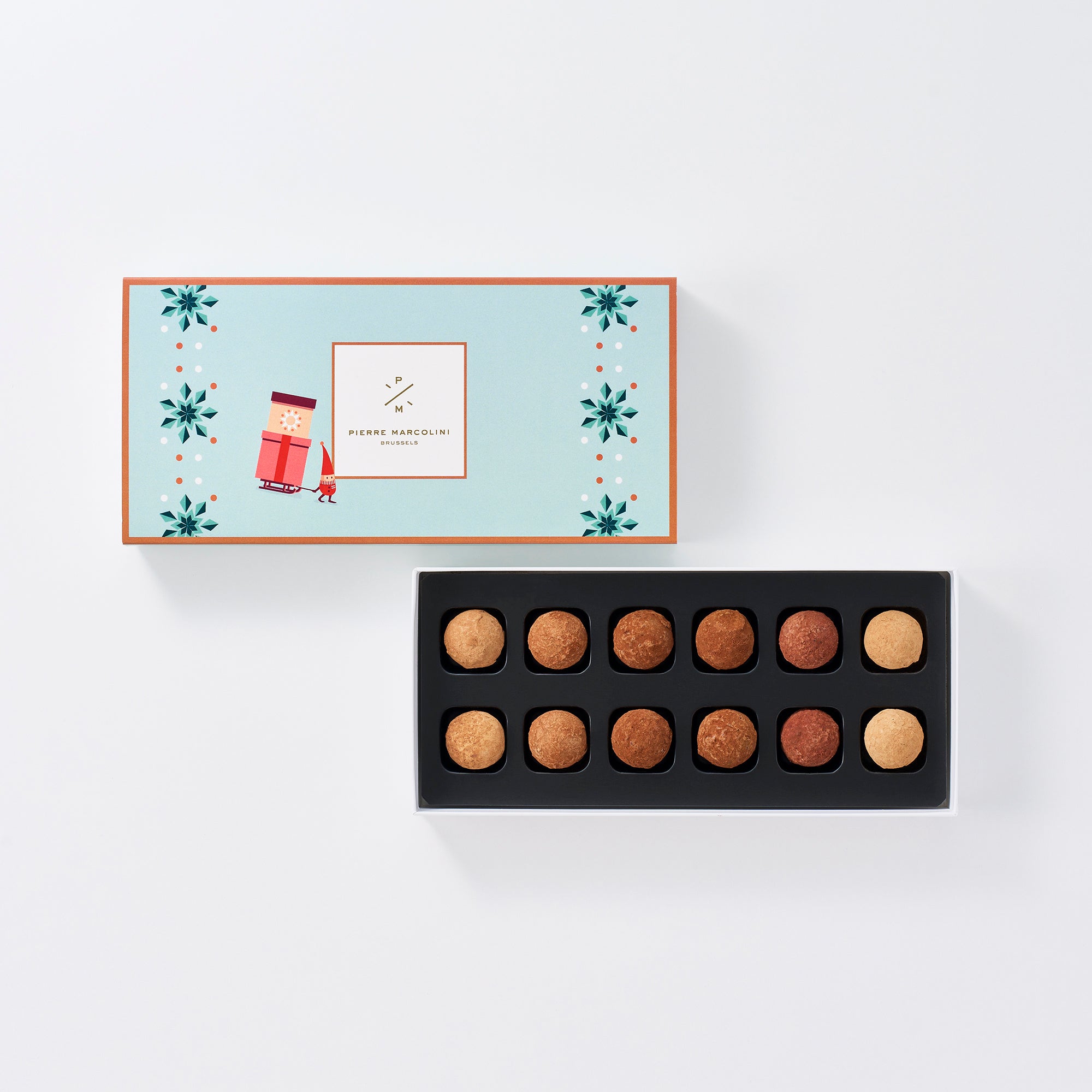 ピエール マルコリーニのオリジナルクーベルチュールで作ったチョコレートシェルの中に、風味豊かでクリーミーなガナッシュを詰め、ココアパウダーでコーティング。トリュフごとにこだわったチョコレートと様々な味のガナッシュによるバラエティ豊かなラインナップをお楽しみください。