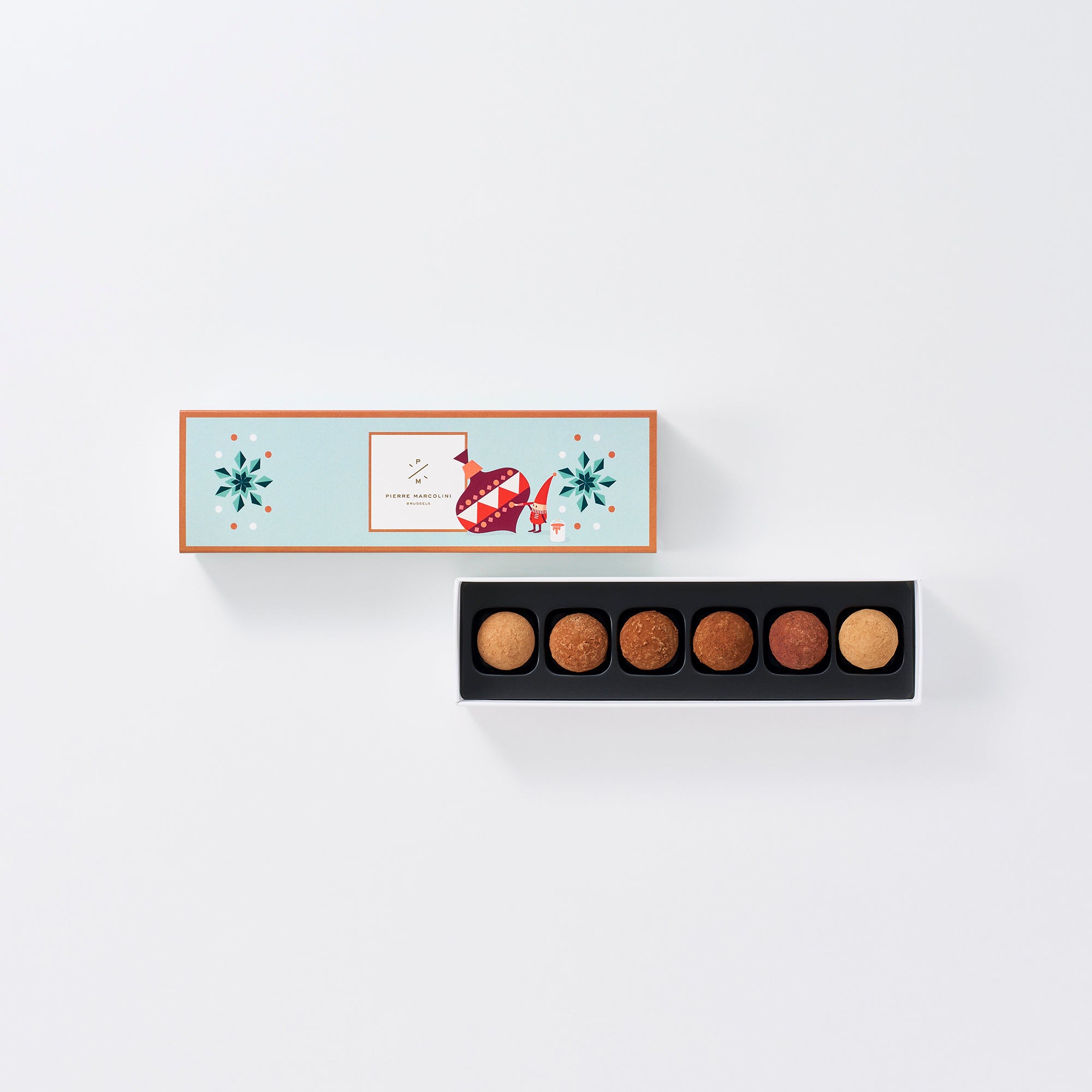 ビターチョコレートの中にマール ドゥ シャンパーニュで香り付けした滑らかなガナッシュを詰め、白いパウダーシュガーを纏わせた、ホリデーシーズンにぴったりのトリュフです。