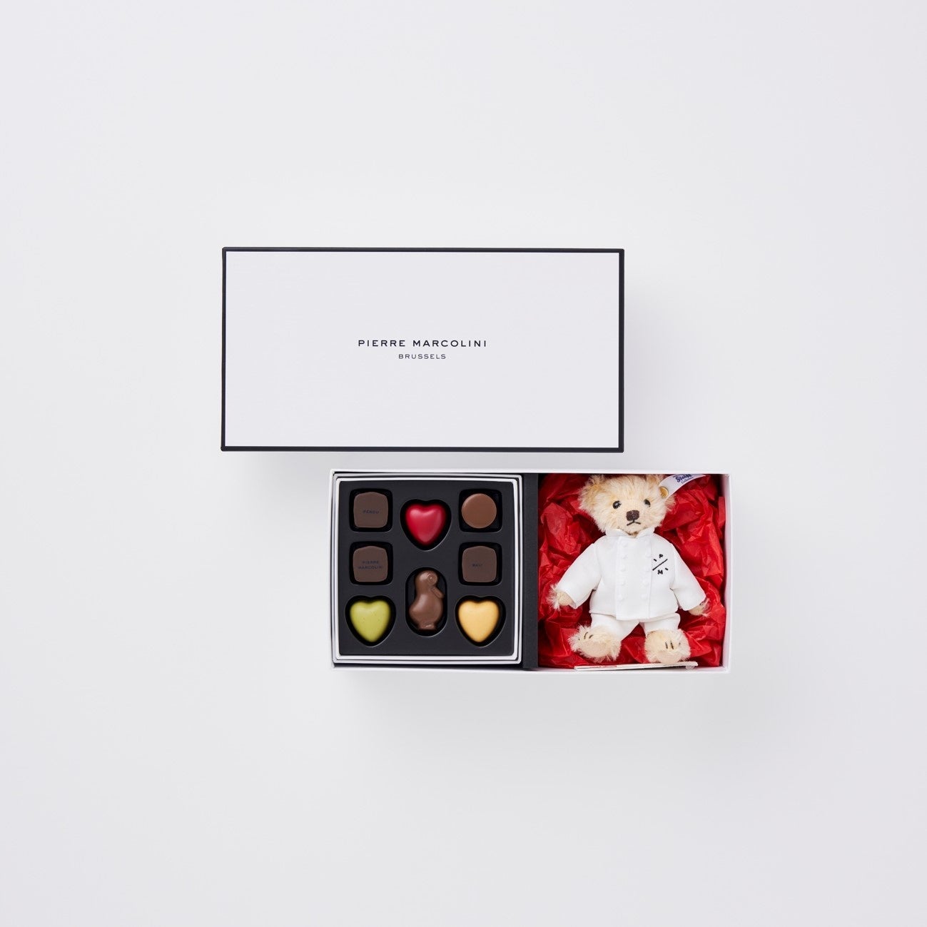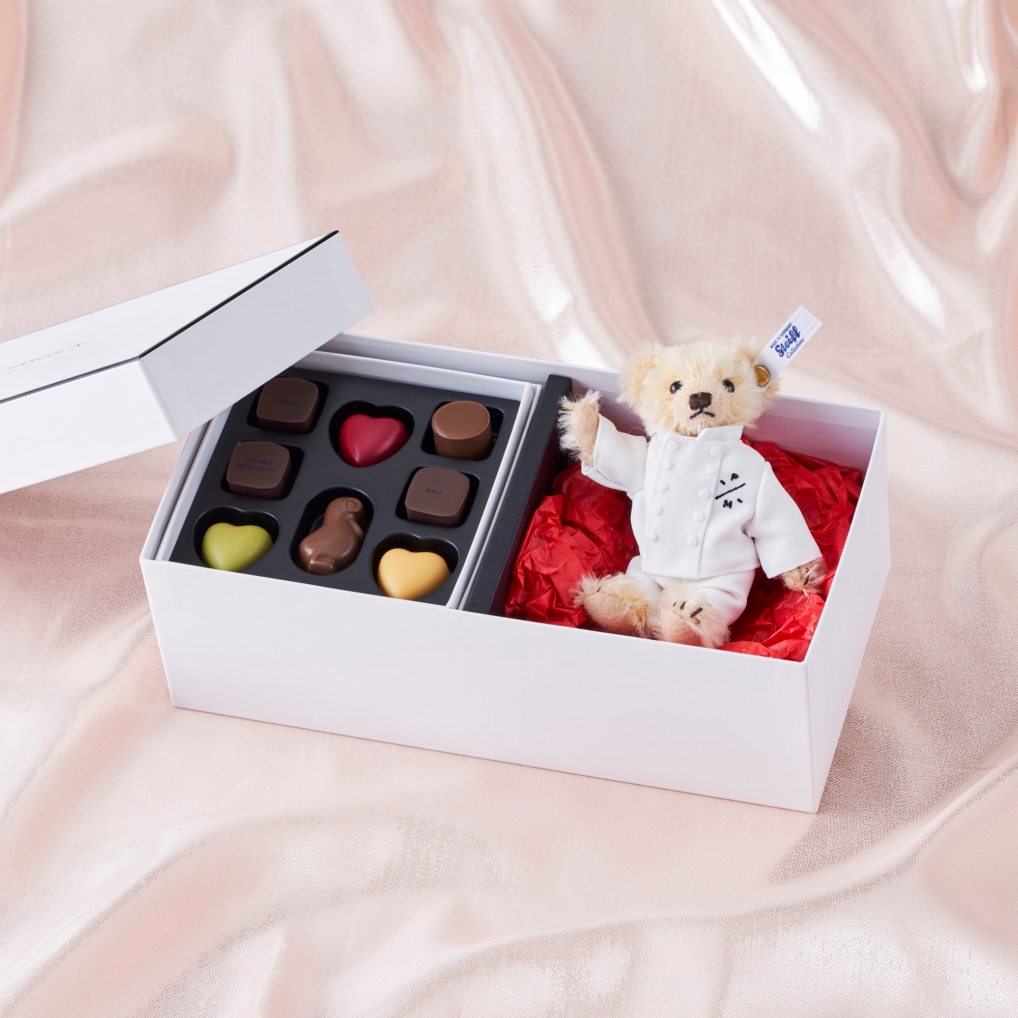ドイツの最高級ぬいぐるみブランド、シュタイフとのコラボレーションで実現した特別限定品。ピエール マルコリーニの定番チョコレートと、コックコートを着たミニテディベアのセット。テディベアは頭・両手・両足を動かせるので、座ったり、お好きなポーズを取らせたりすることができます。