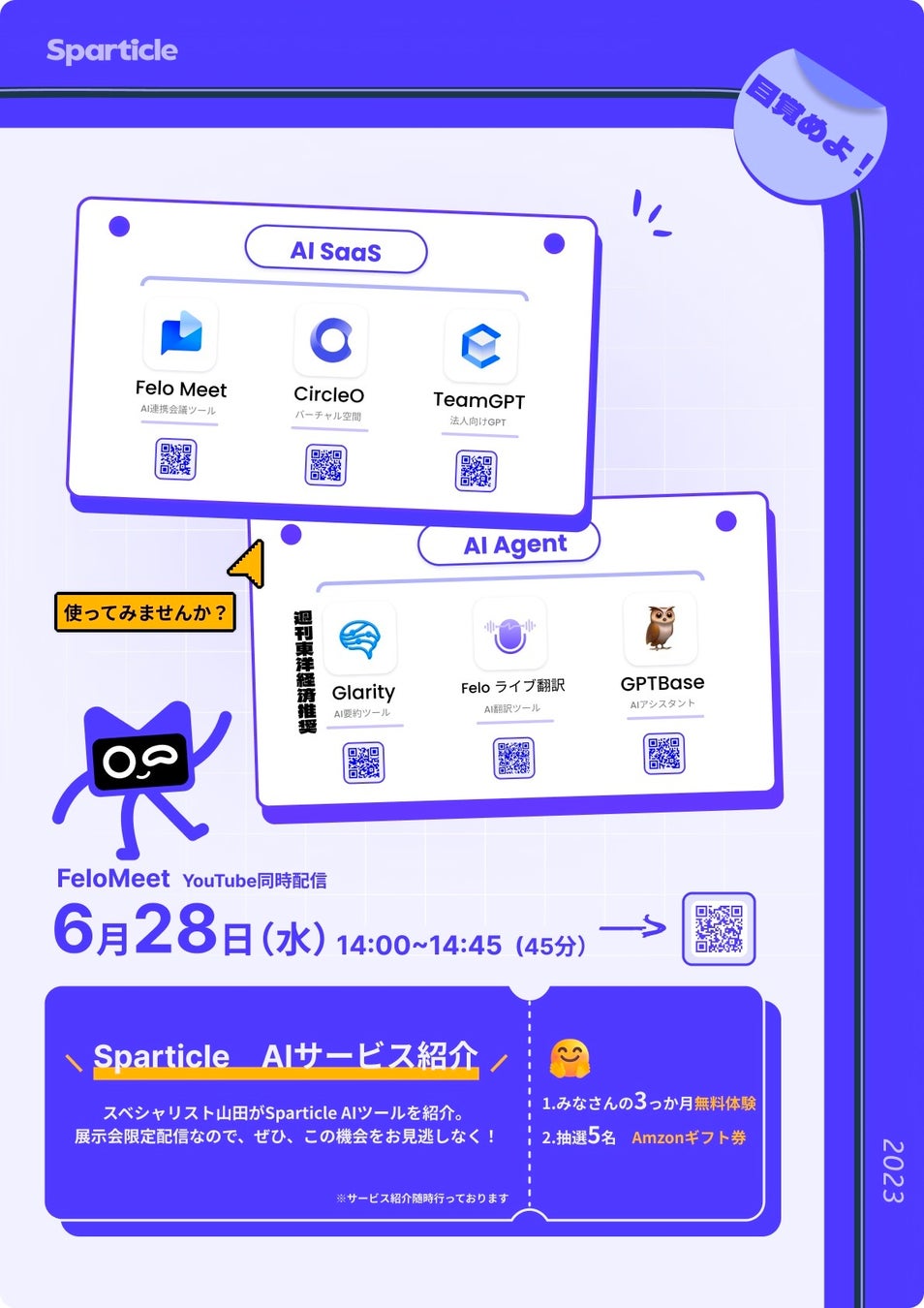 Sparticle社が初めてのAIツールに関する無料オンラインセミナーを開催することを発表しました。このセミナーでは、同社の最新AI関連ツールであるGPTBase、Glarity、およびFelo 瞬訳が紹介されます。参加者に、これらのツールの応用方法や可能性について紹介し、デモンストレーションを通じて実際の活用例を提案しようという試みです。AI技術への関心が高まる中、Sparticle社のオンラインセミナーへ多くの期待が寄せられています。